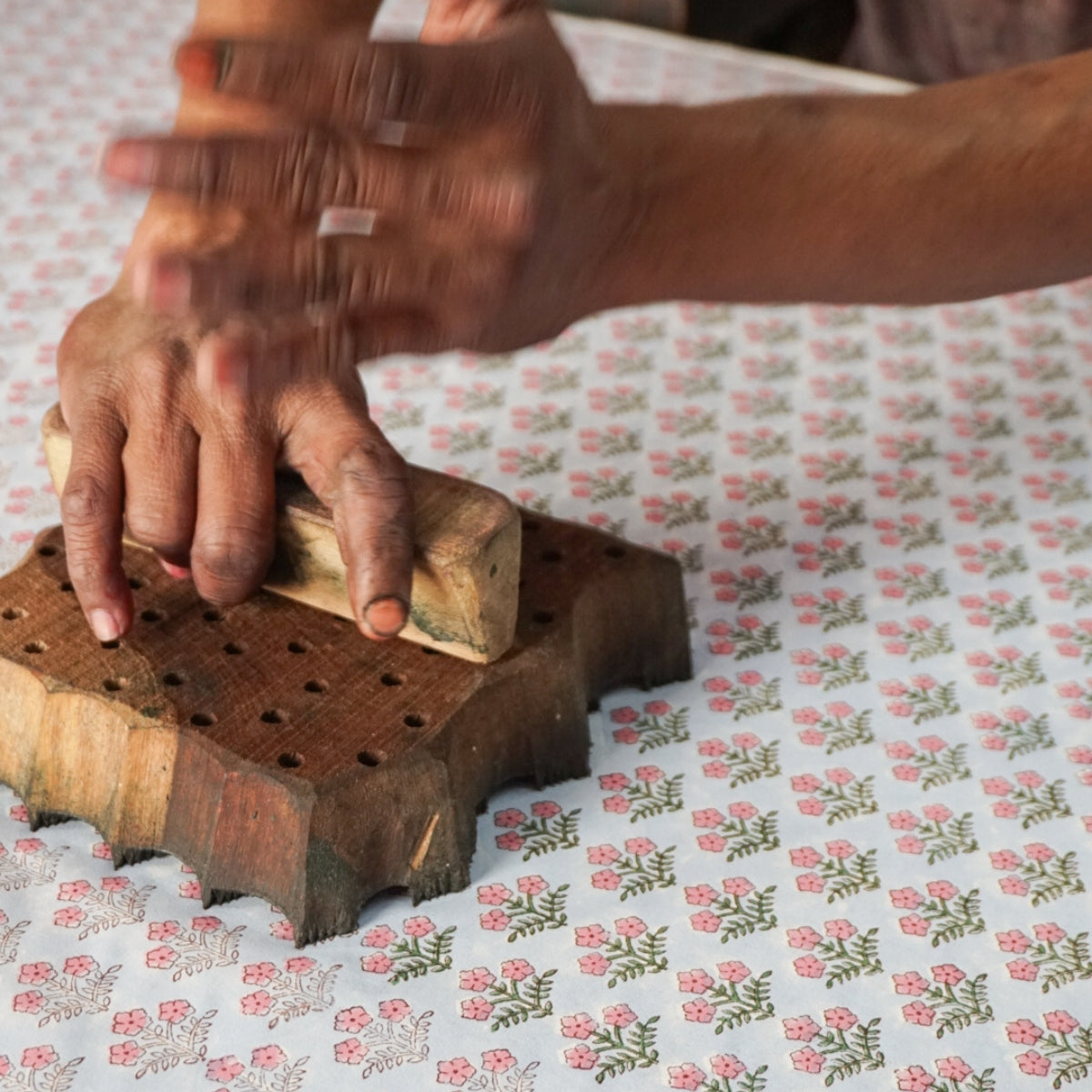 Our fabrics are printed using traditional block printing techniques, where carved wooden blocks are pressed onto the fabric one layer at a time.