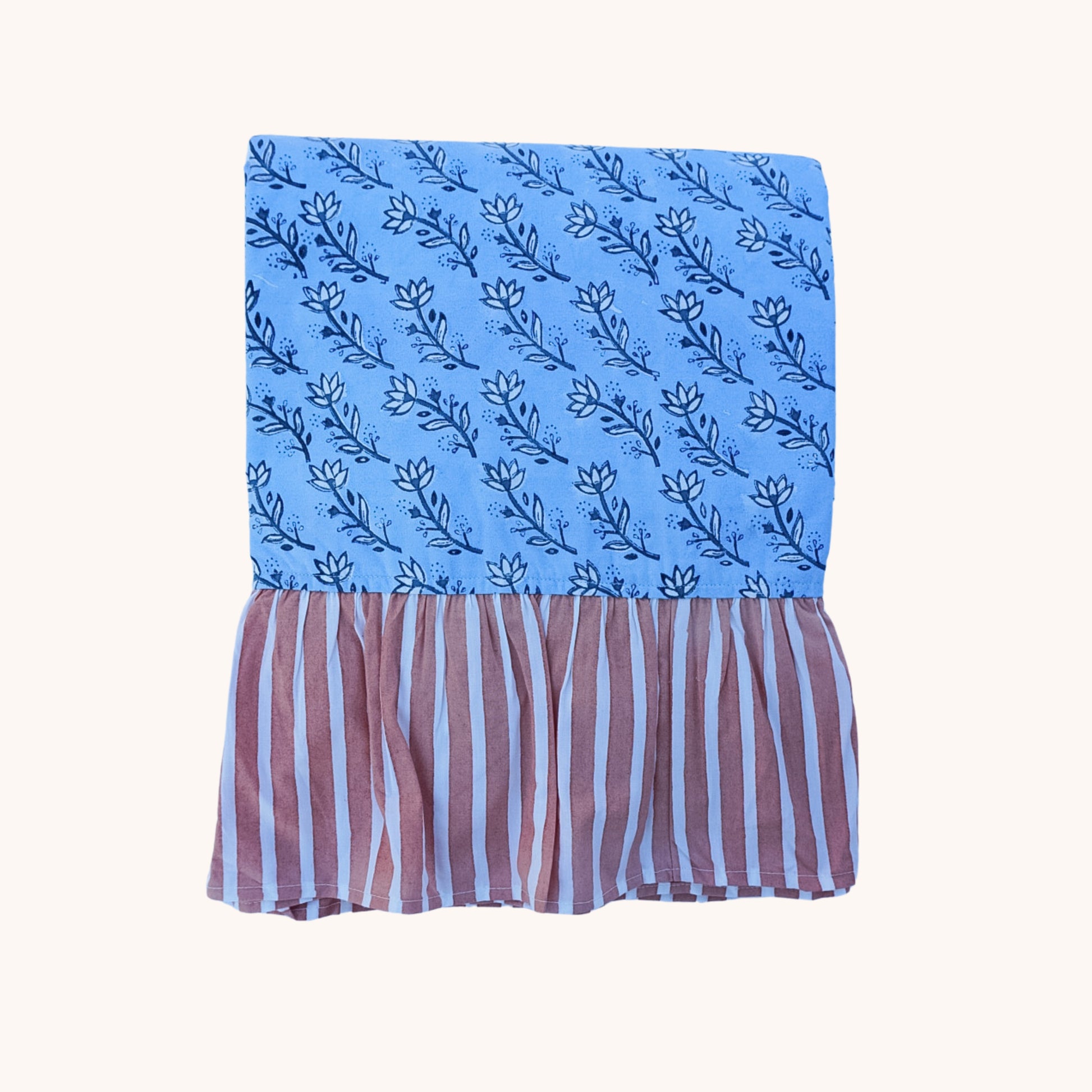 Each tablecloth begins as a hand-painted design by Jessica , which is then meticulously carved into wooden blocks and hand-printed by skilled artisans in Jaipur.