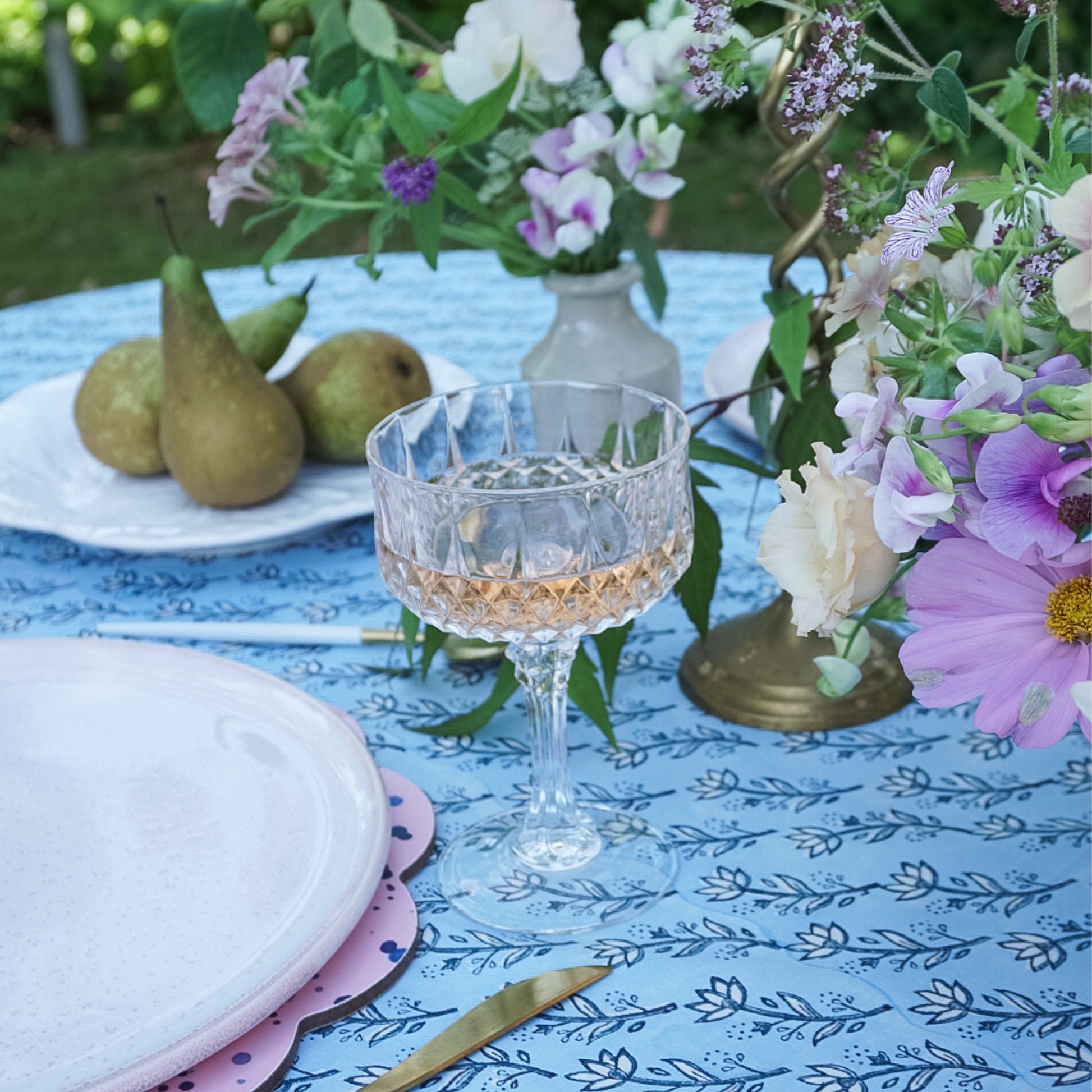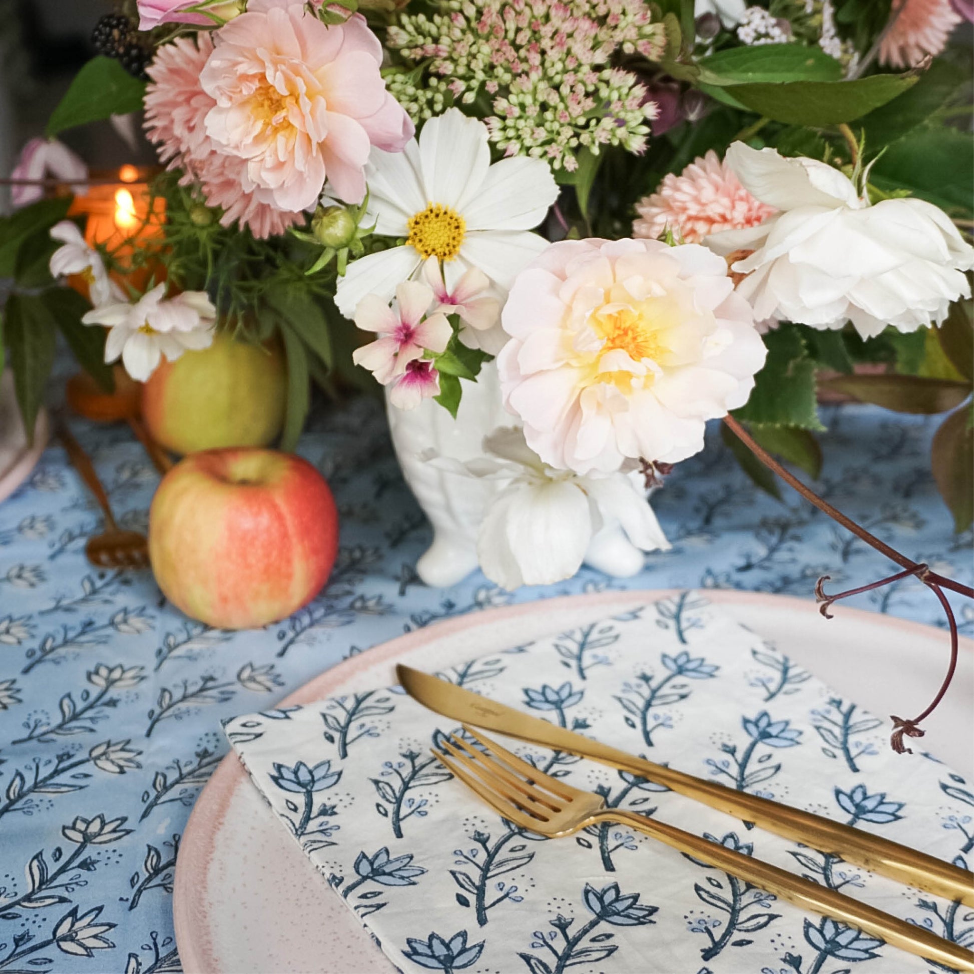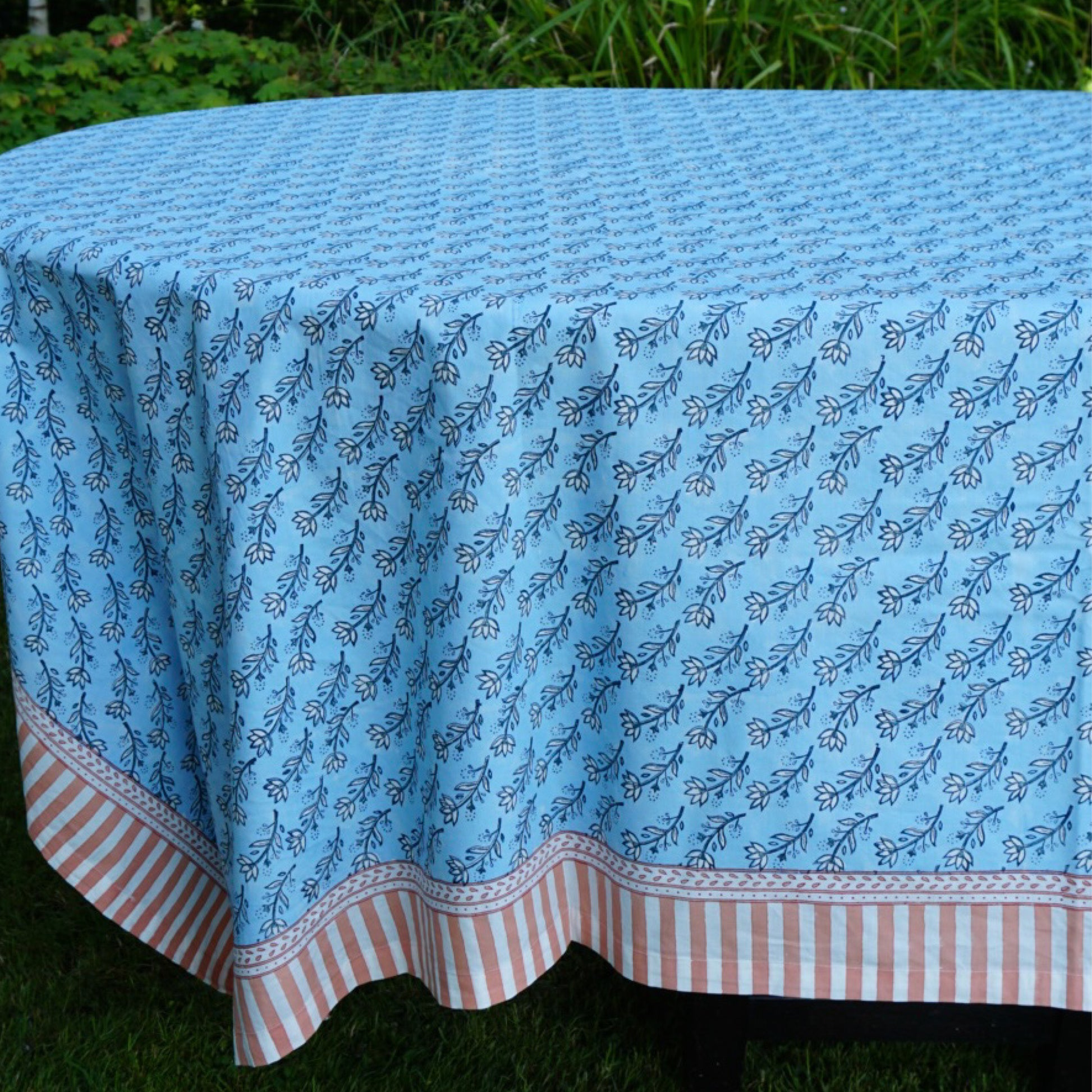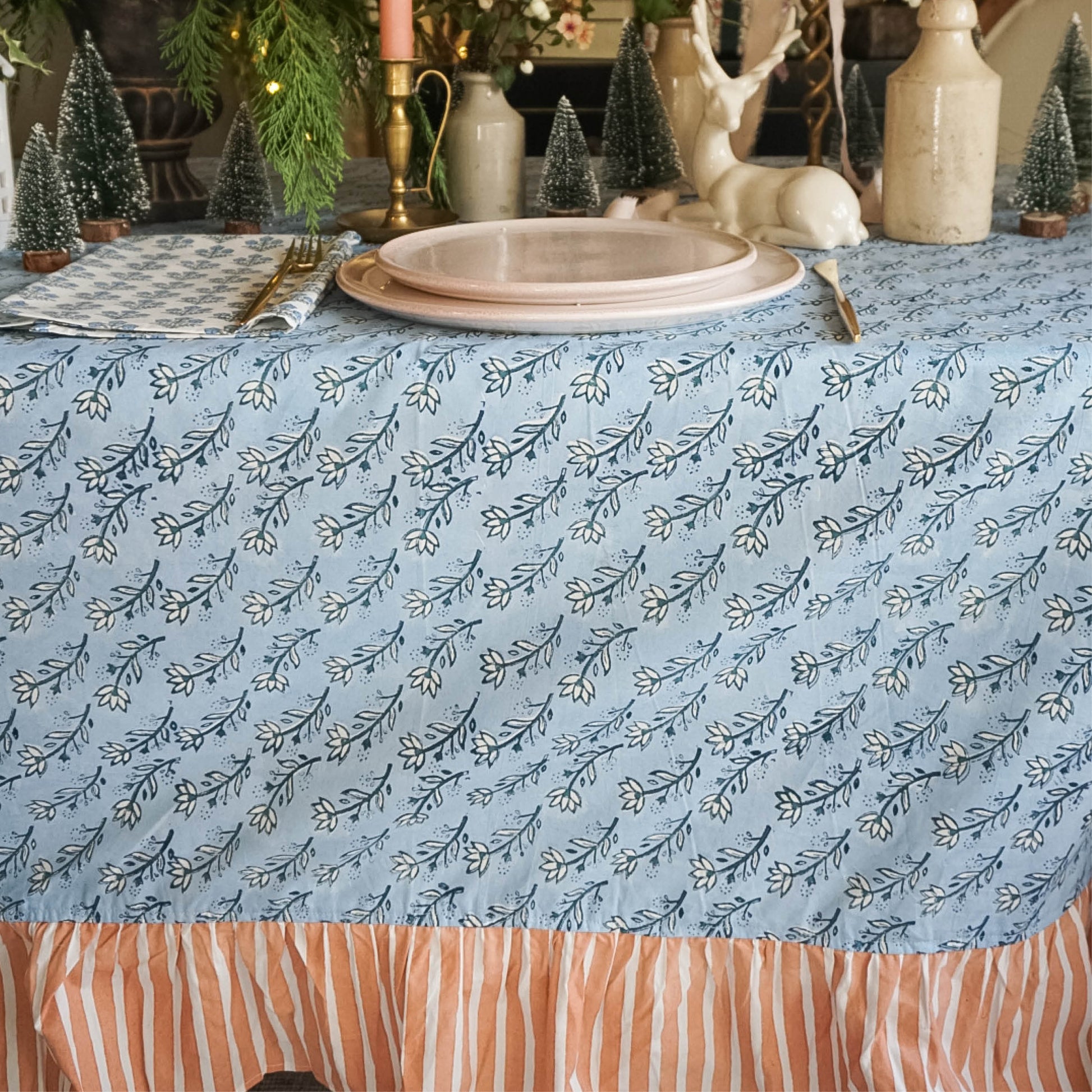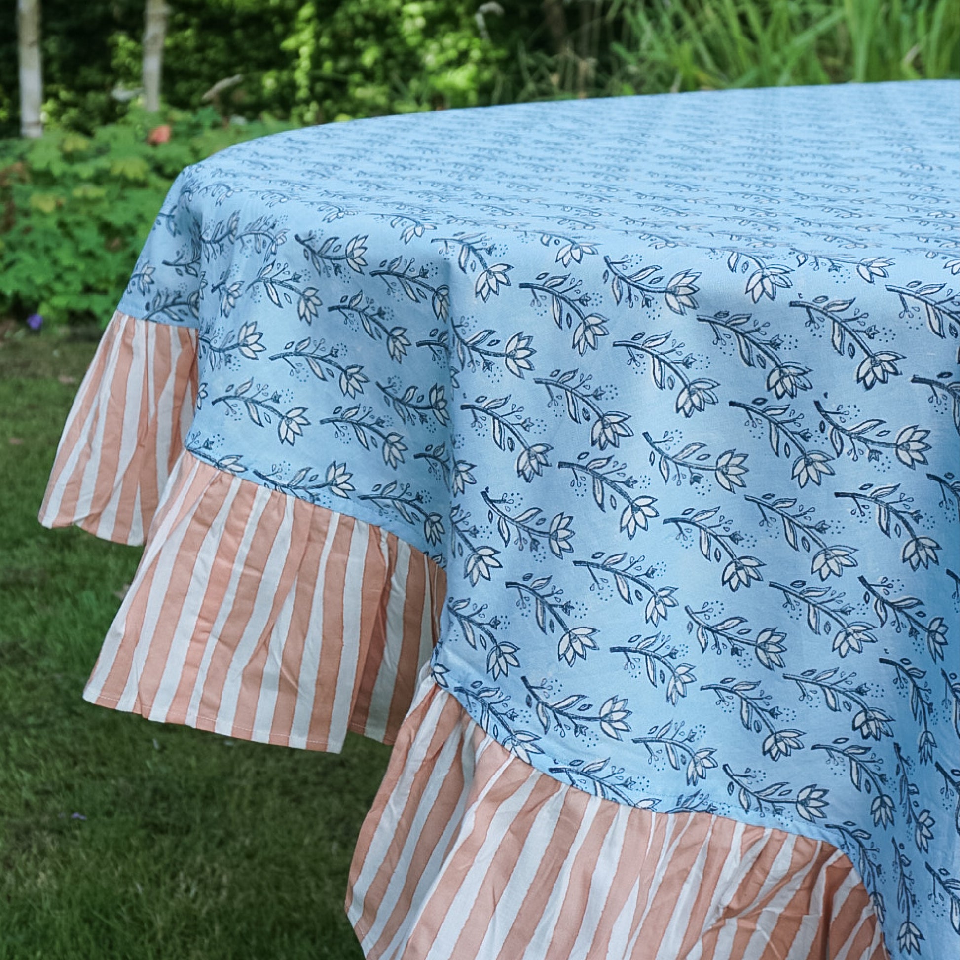 Introducing the Elle Tablecloth - an elegant blue floral design with a peach edge to make it stand out.