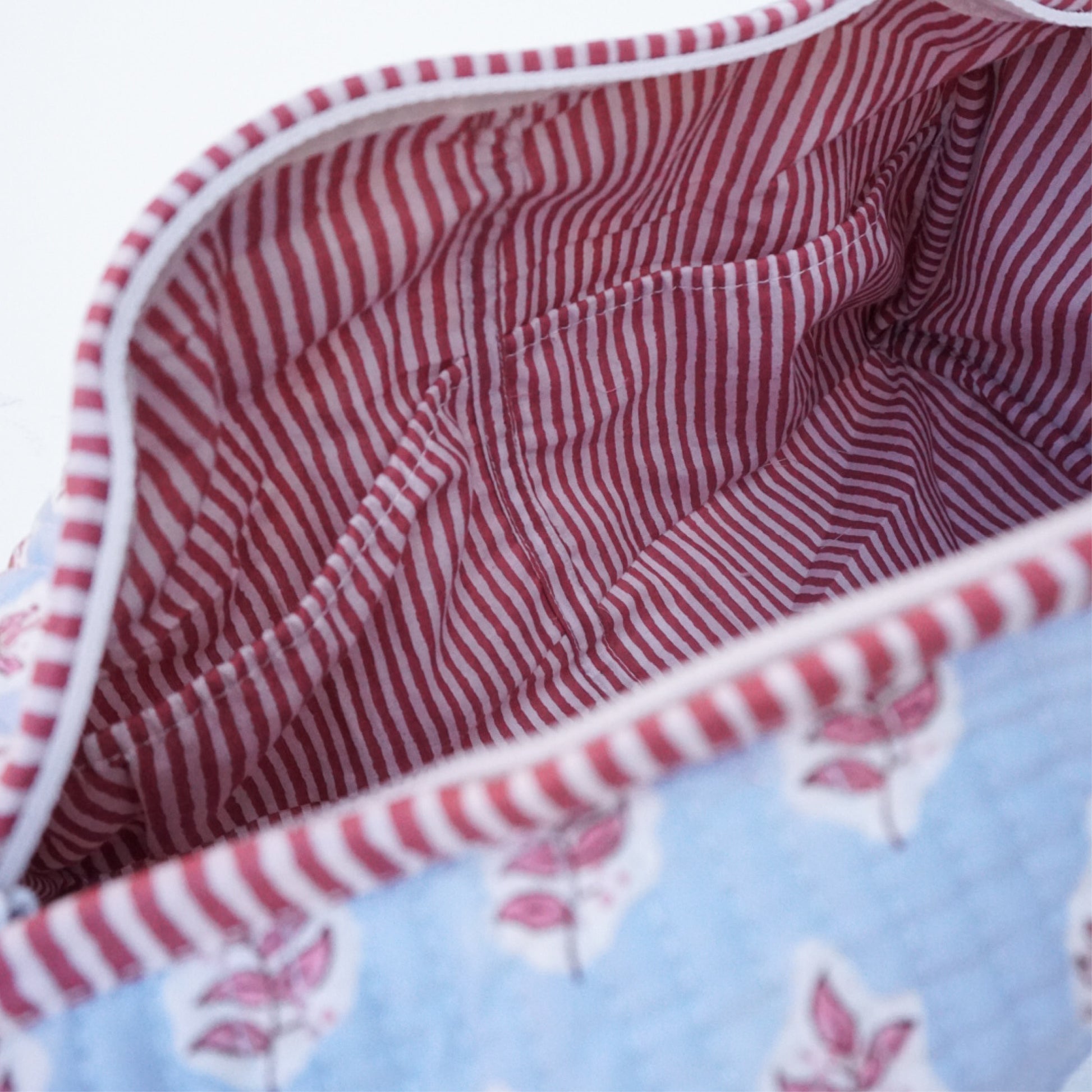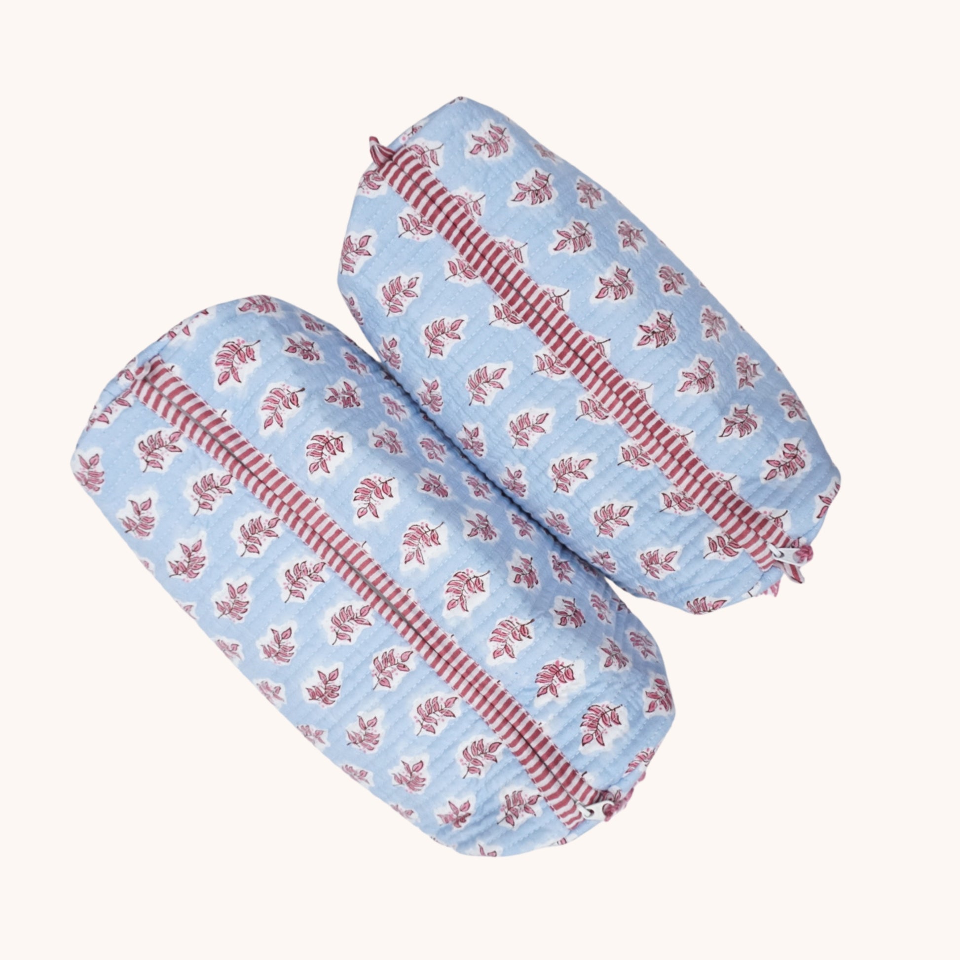 The fabric is block printed by hand in Jaipur using traditional techniques, before being made into the final piece.