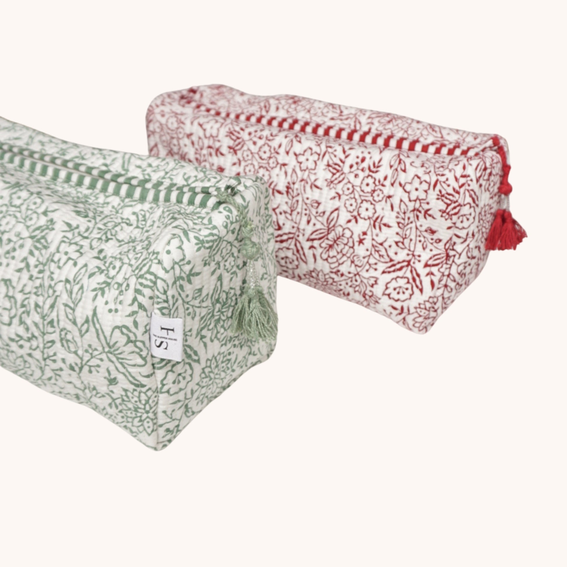 Each wash bag is hand block-printed by skilled artisans using our hand-drawn patterns, so every piece is slightly unique. Crafted from natural cotton and fully lined with four internal pockets, it keeps your essentials organised while looking effortlessly chic.