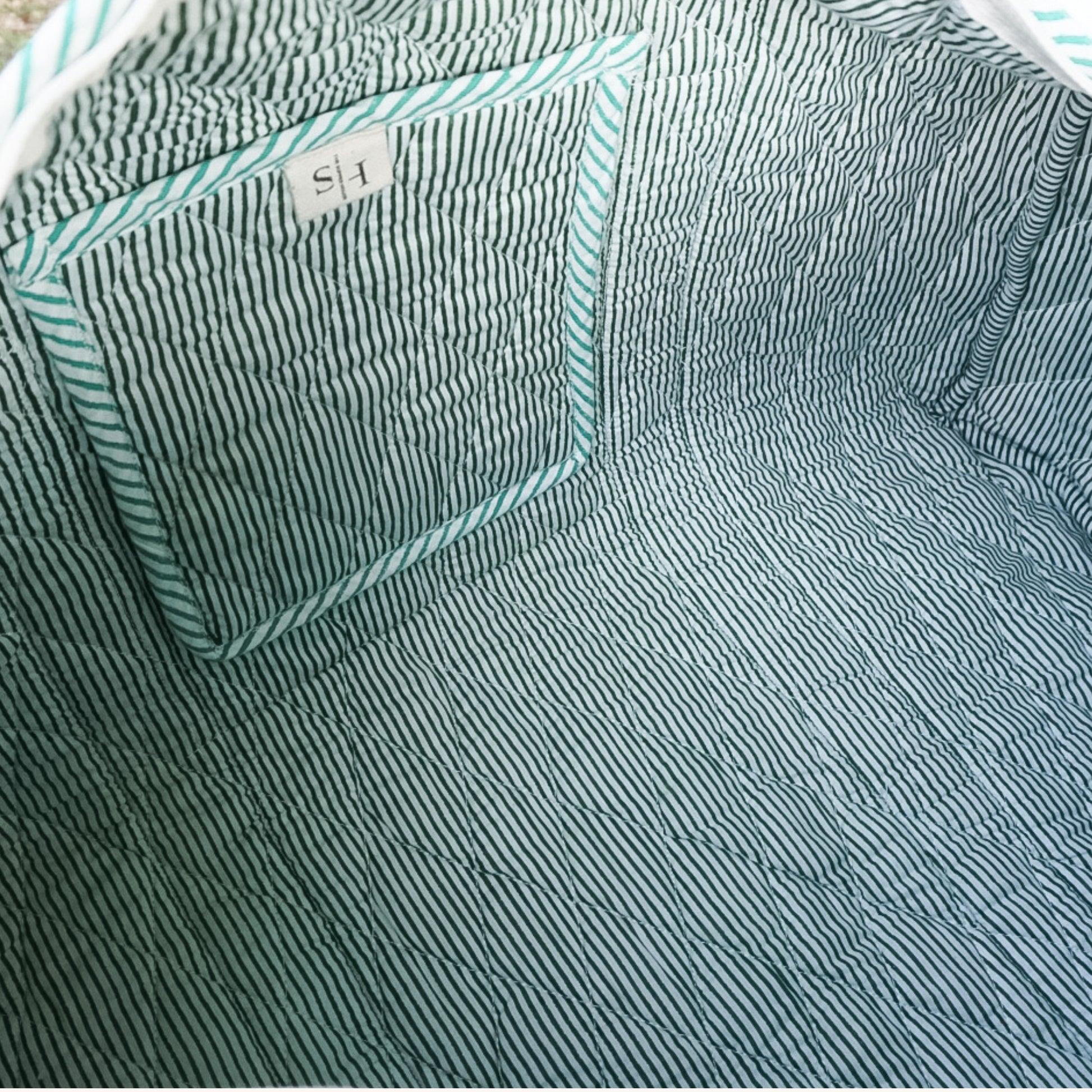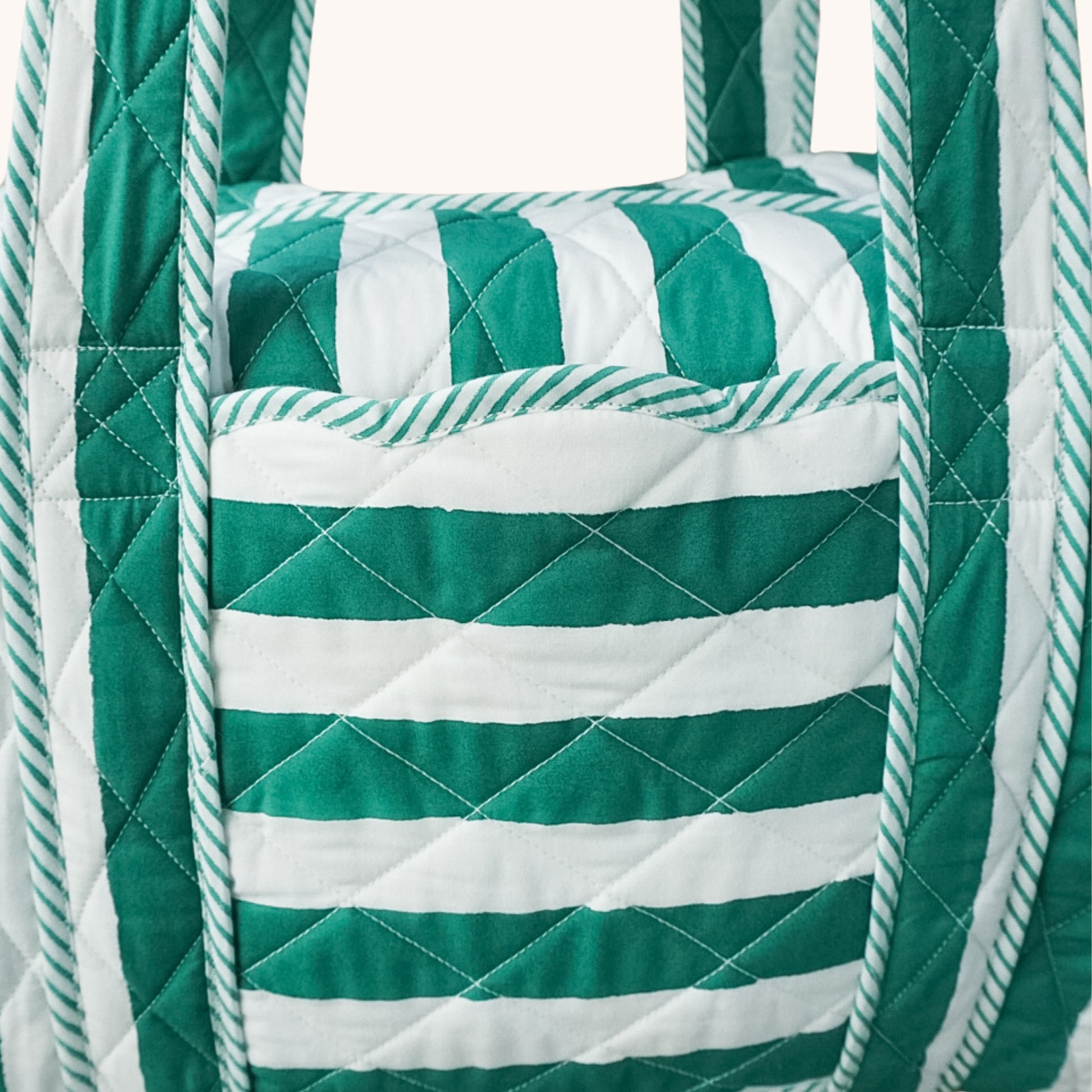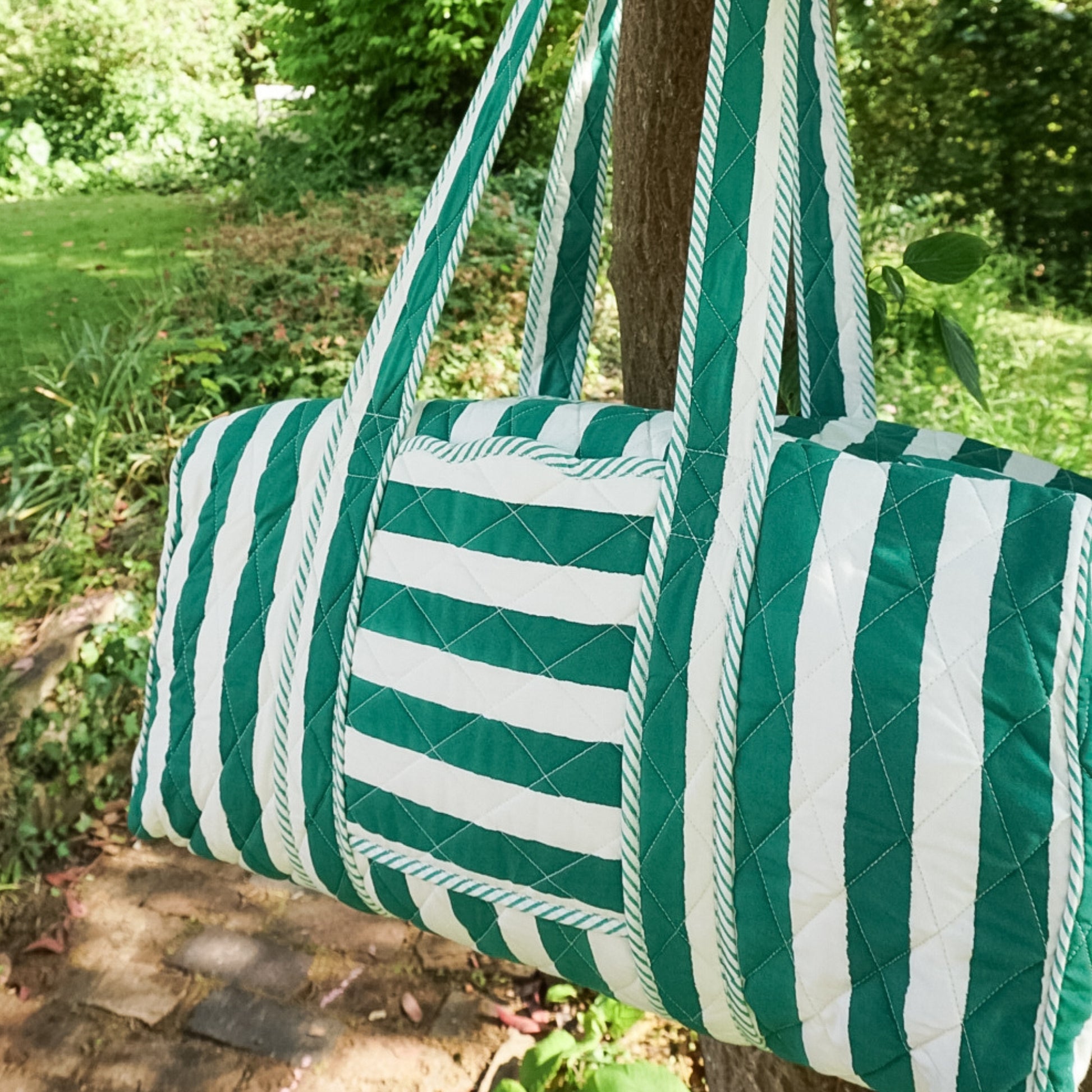 Introducing our brand new striped weekend bag perfect for slow mornings, spontaneous escapes, and everything in between. Printed in emerald green stripes with piped edging.