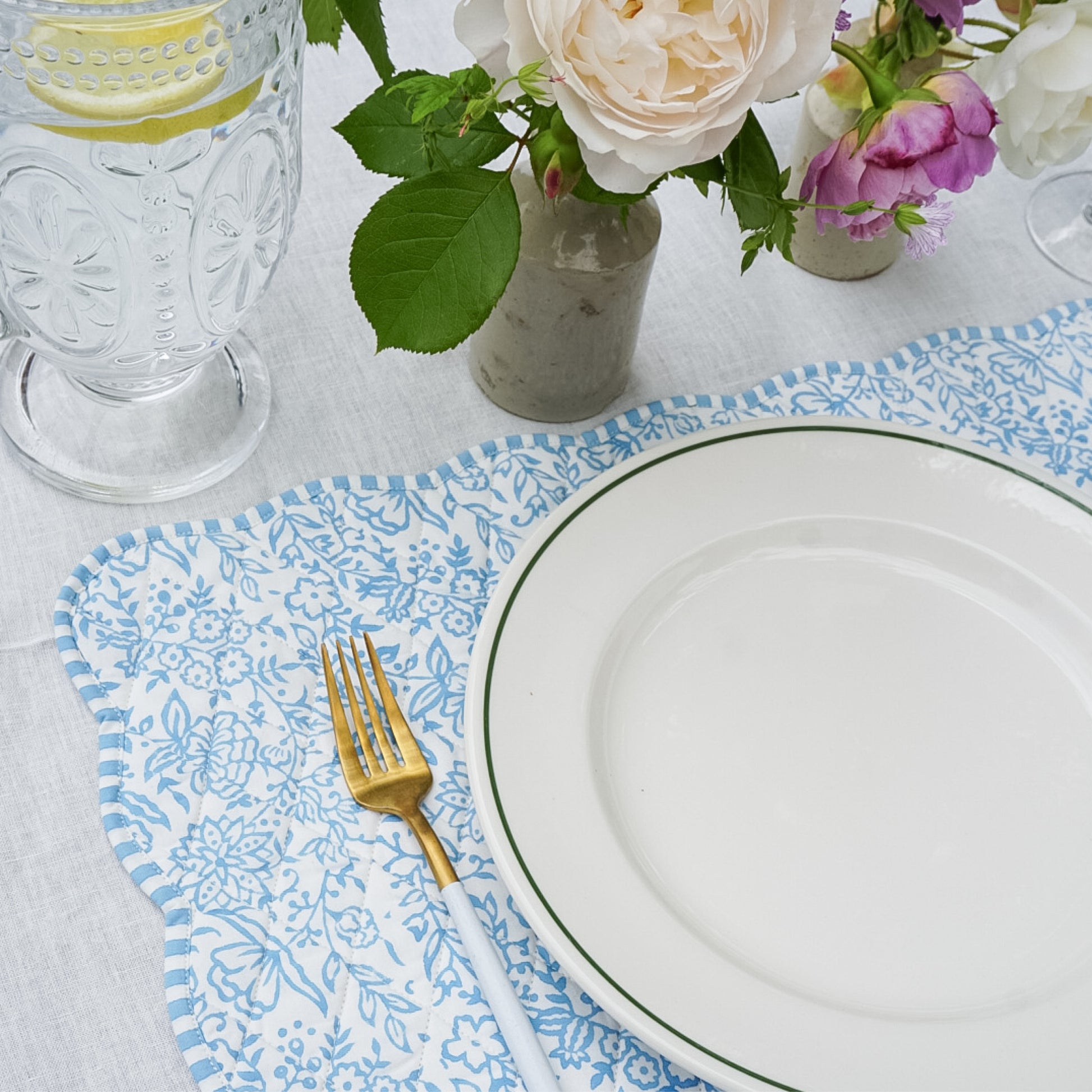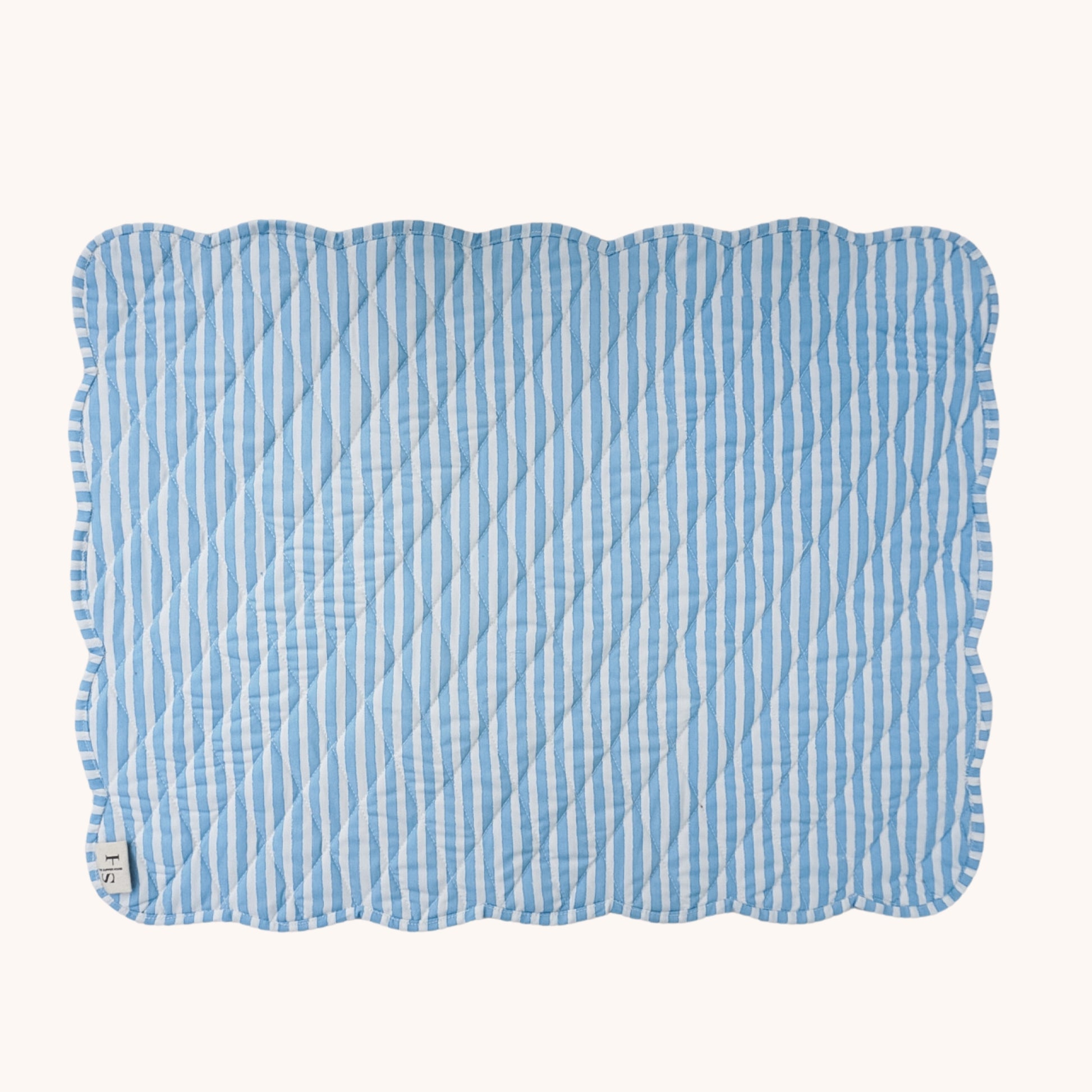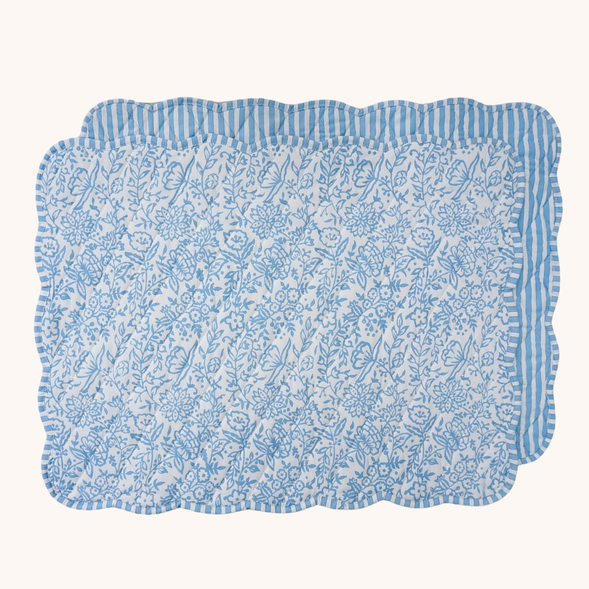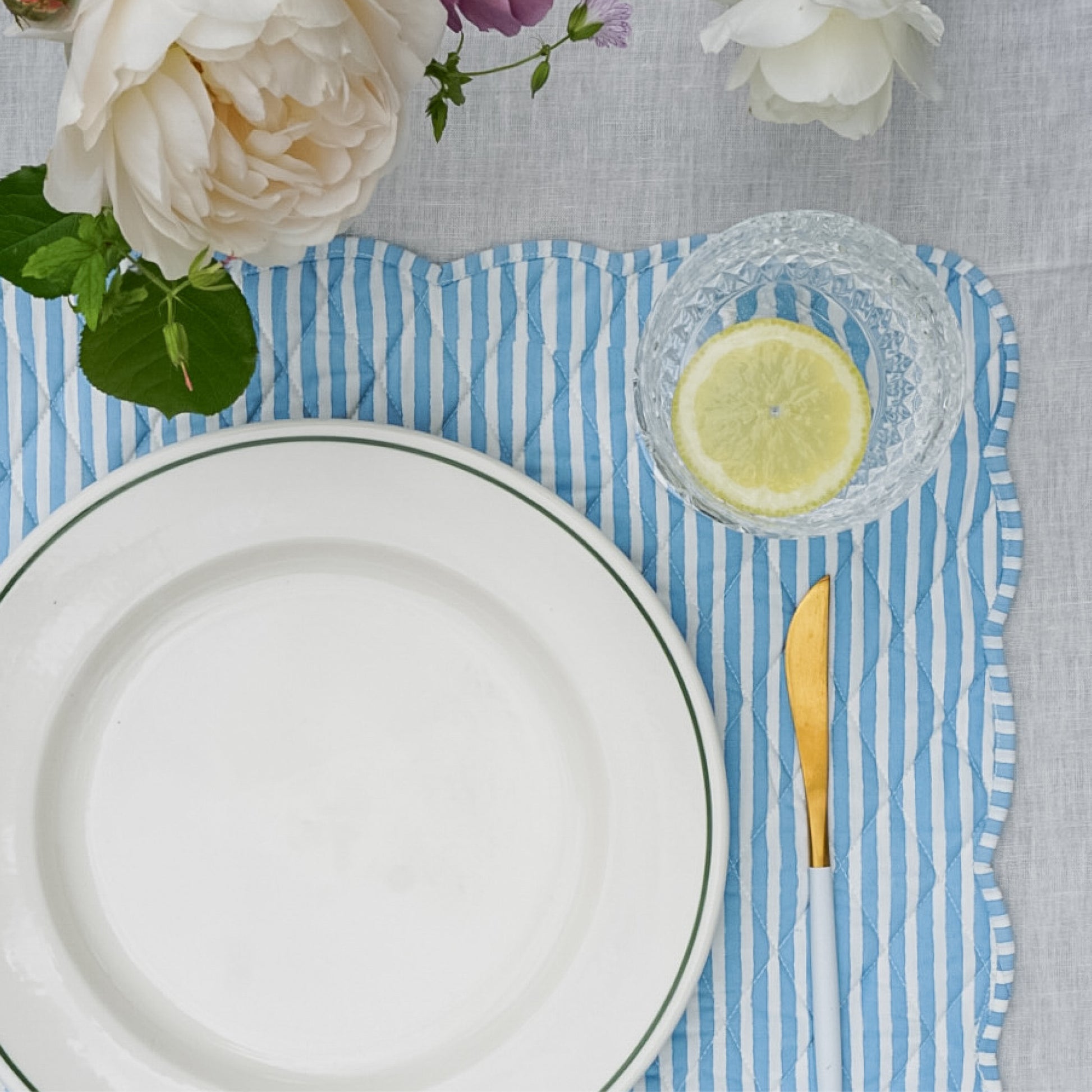 Our best selling Hazel design has been reimagined into blue quilted placemats. Designed to be reversible with stripes on the other side. The mats are quilted and finished with a scalloped edge.