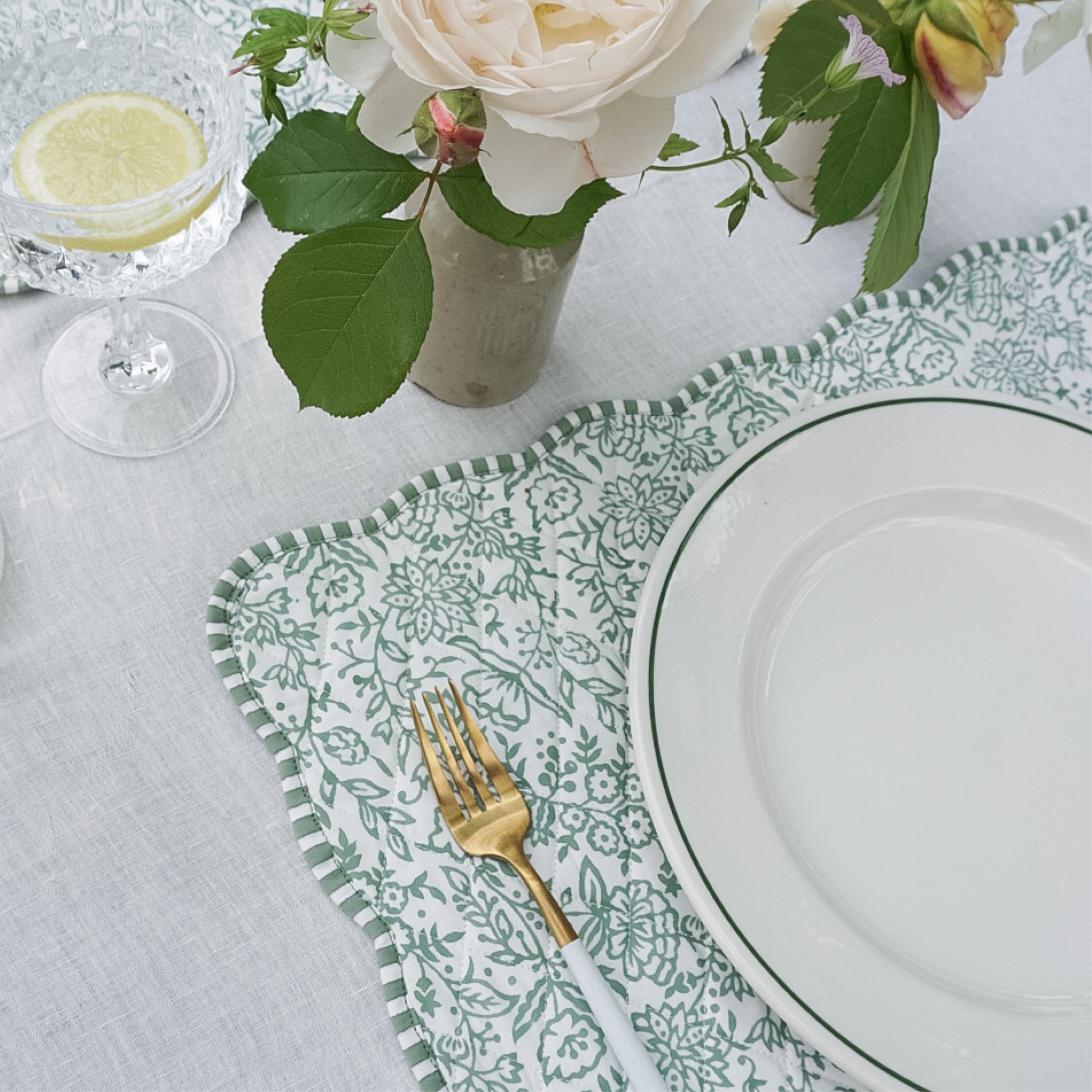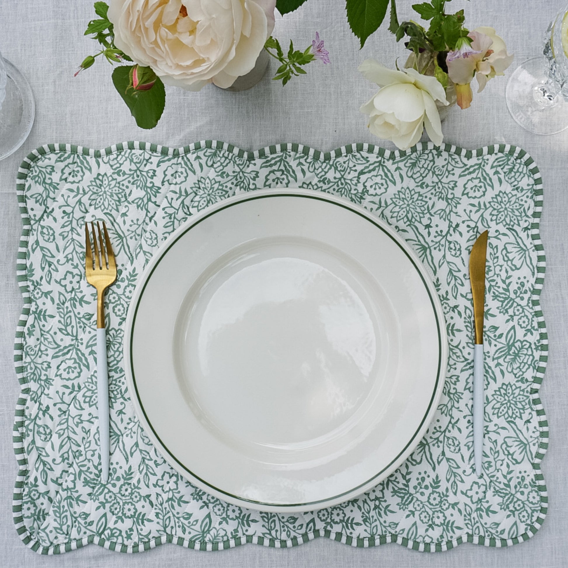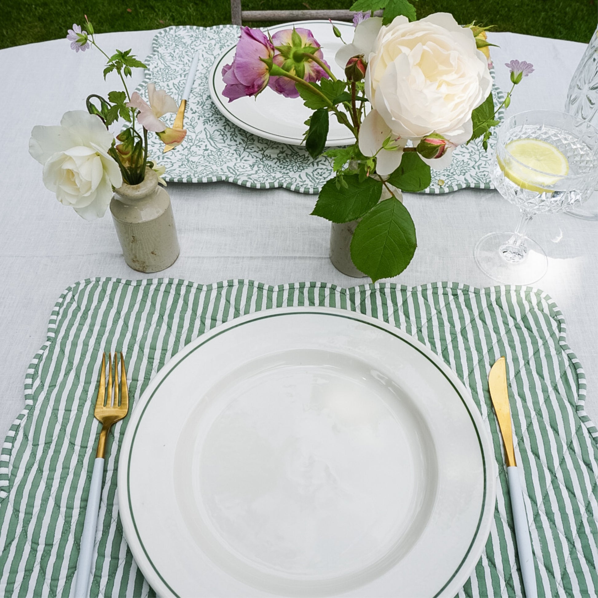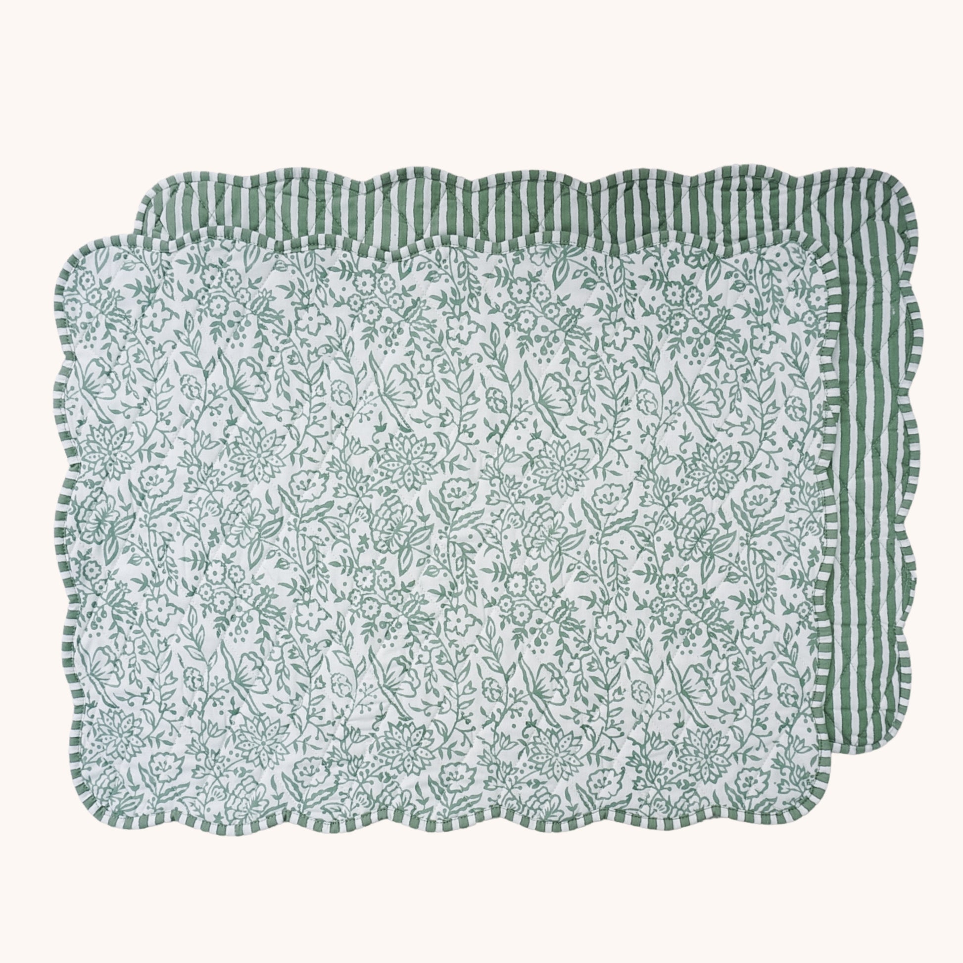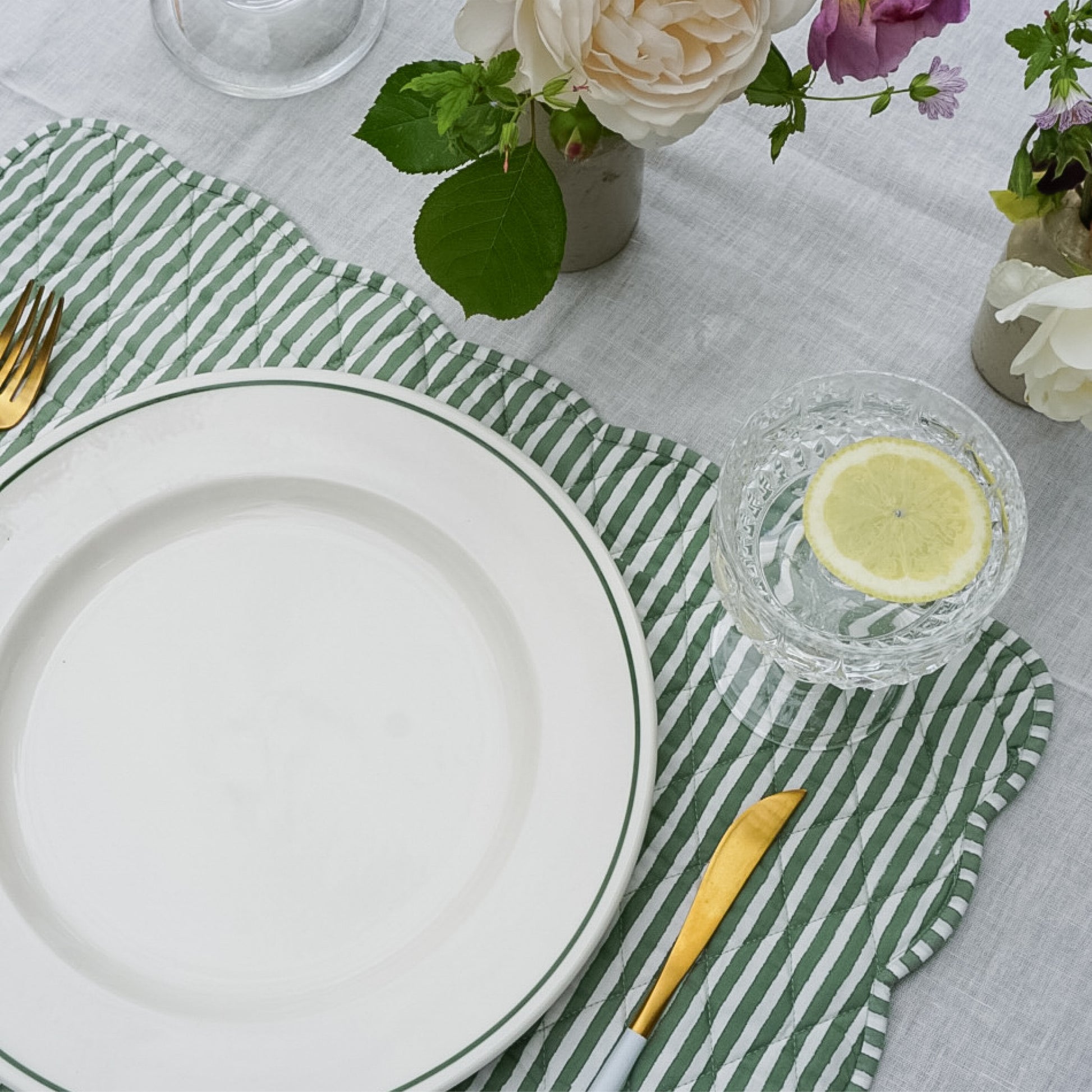 Our best selling Hazel design has been reimagined into green quilted placemats. Designed to be reversible with stripes on the other side. The mats are quilted and finished with a scalloped edge.