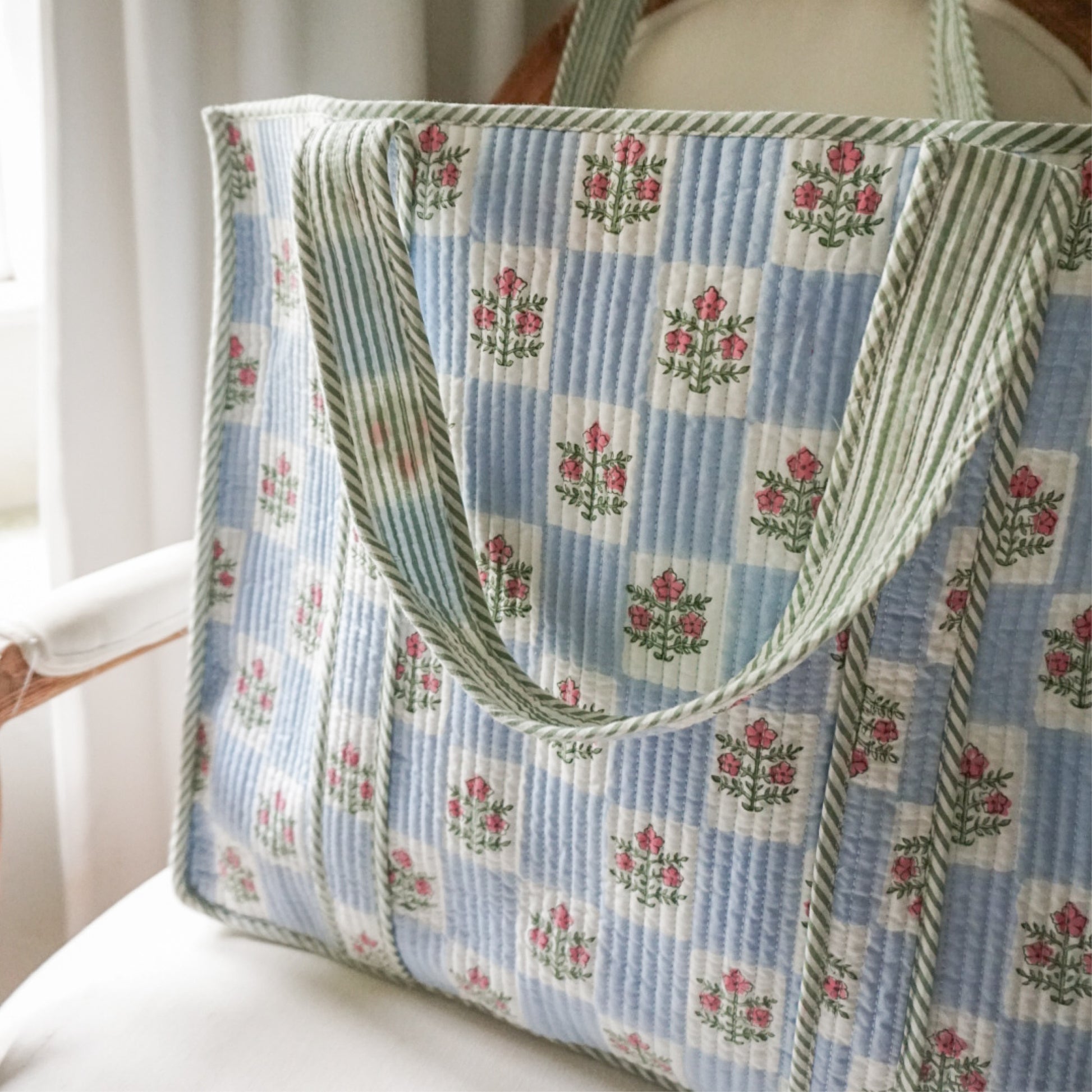 Each tote features an original Supper House print, designed in-house and hand block printed in Jaipur using traditional wooden blocks.Â