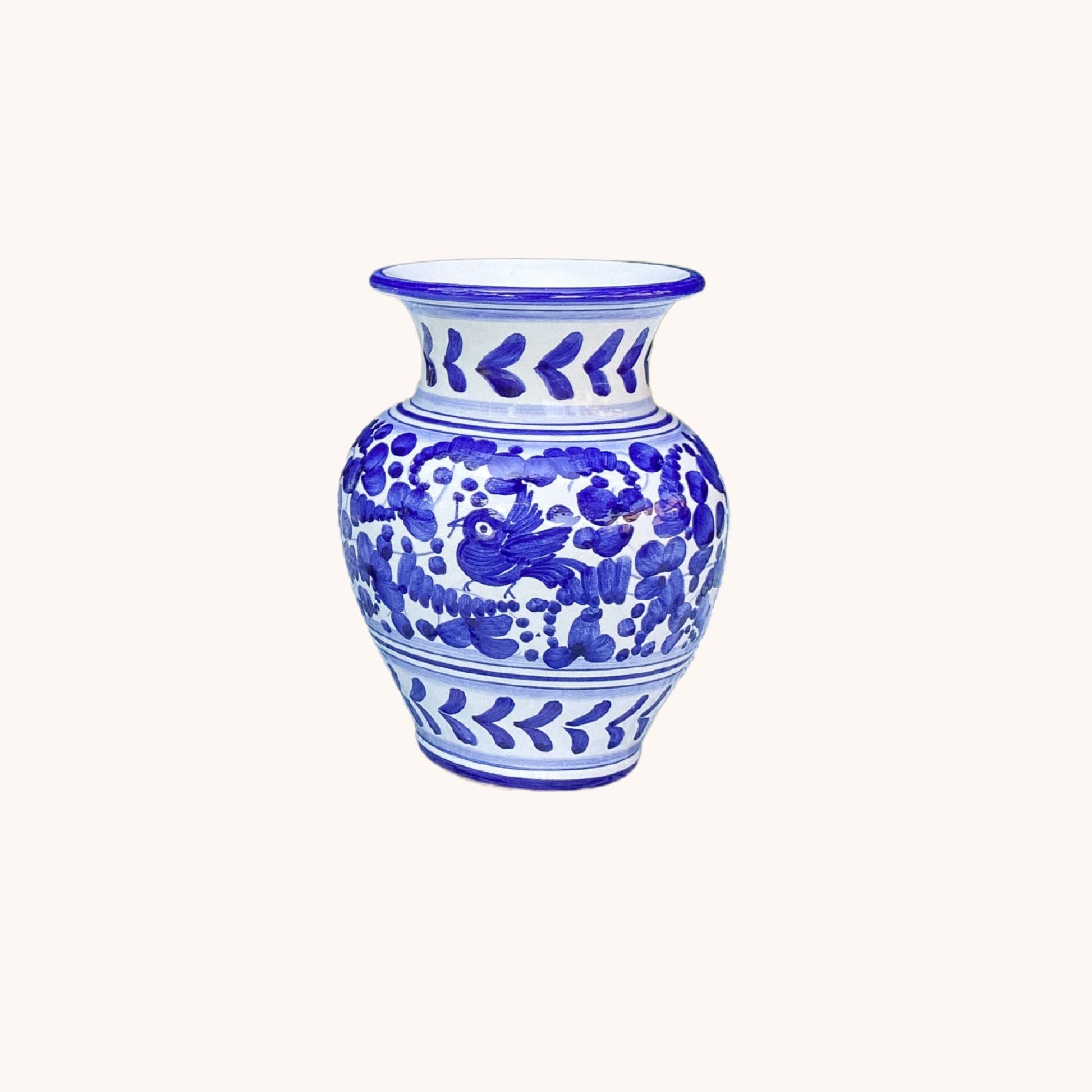 Hand painted Italian Vase in blue. Exquisitely detailed, these vases come in three colours and are the perfect height to fill with florals for your table.