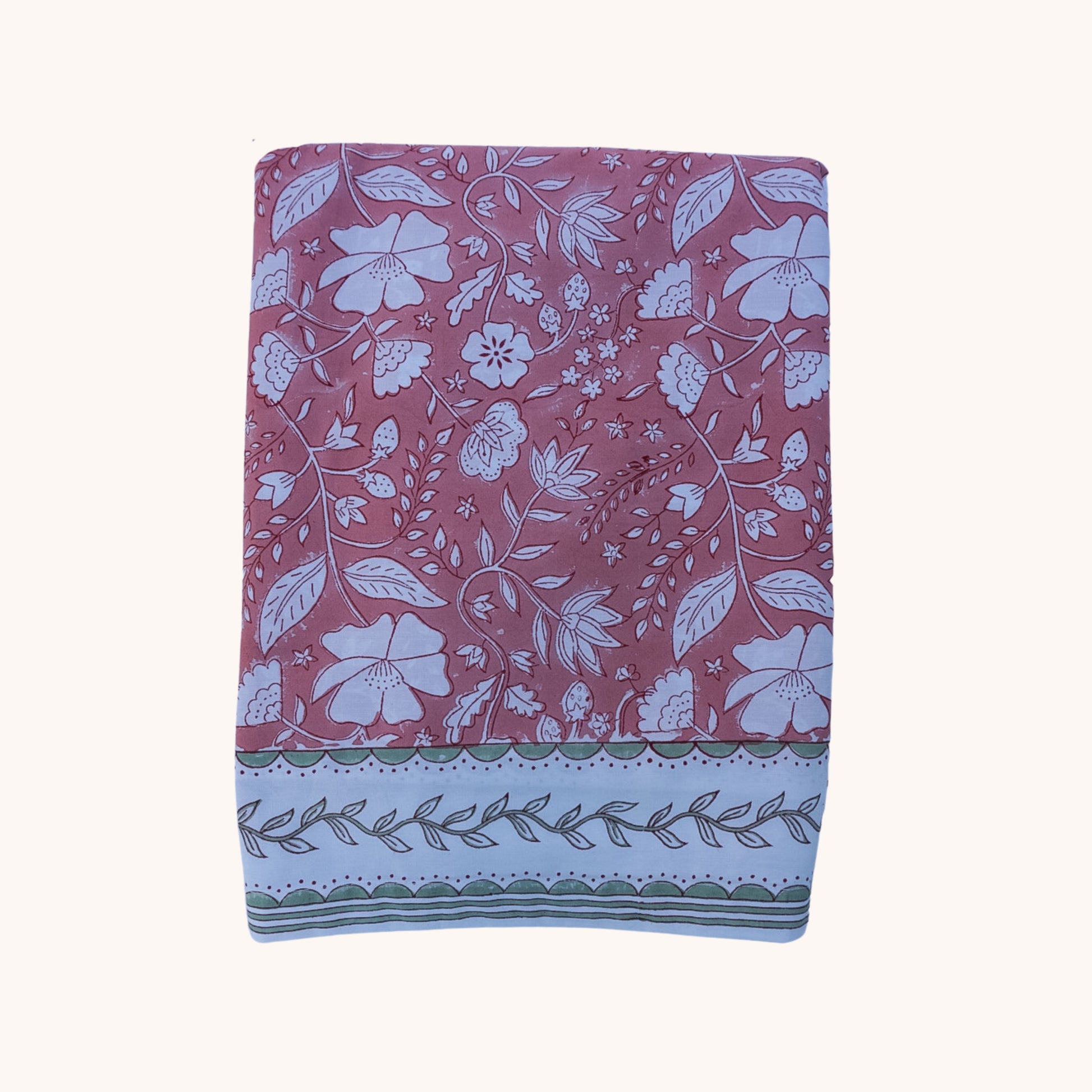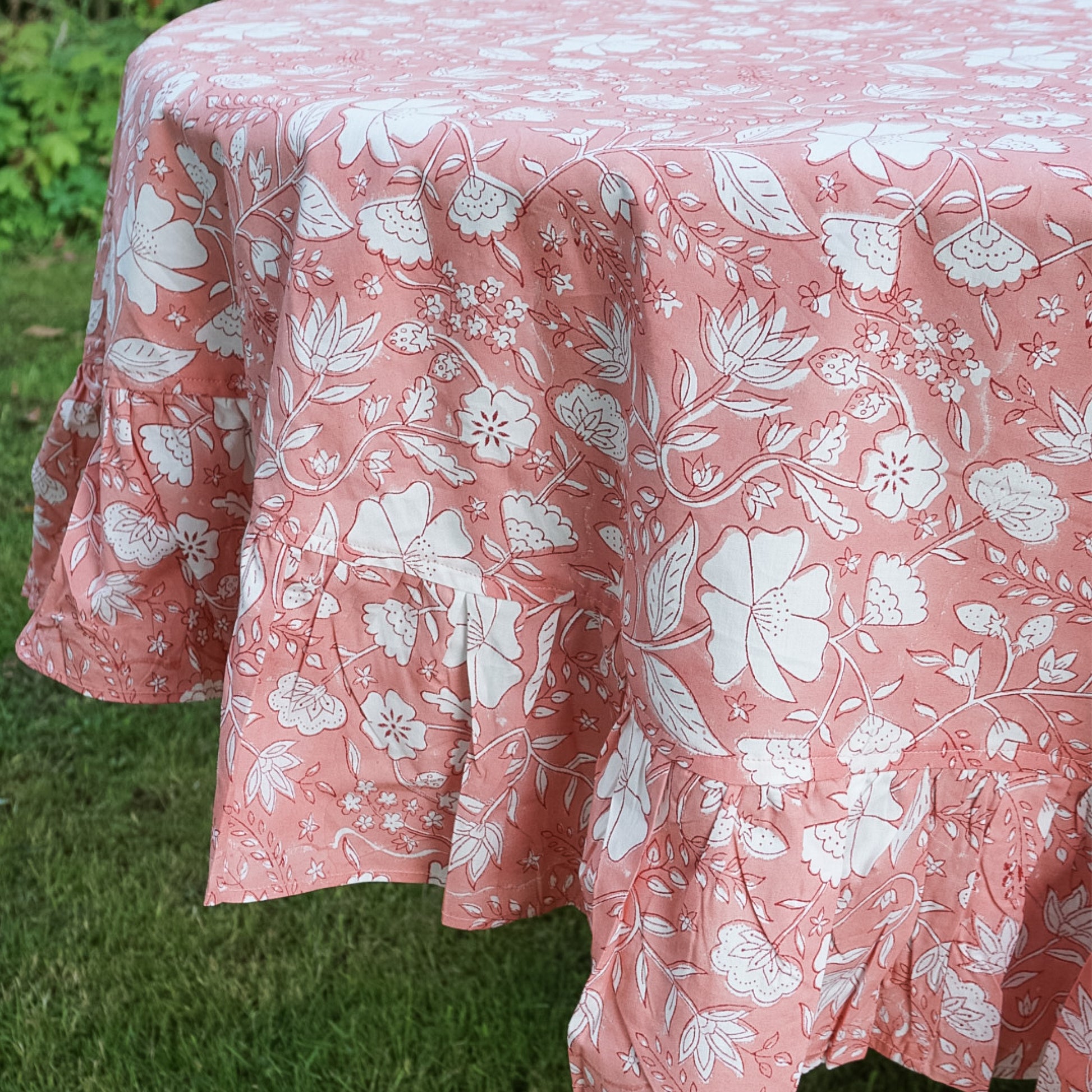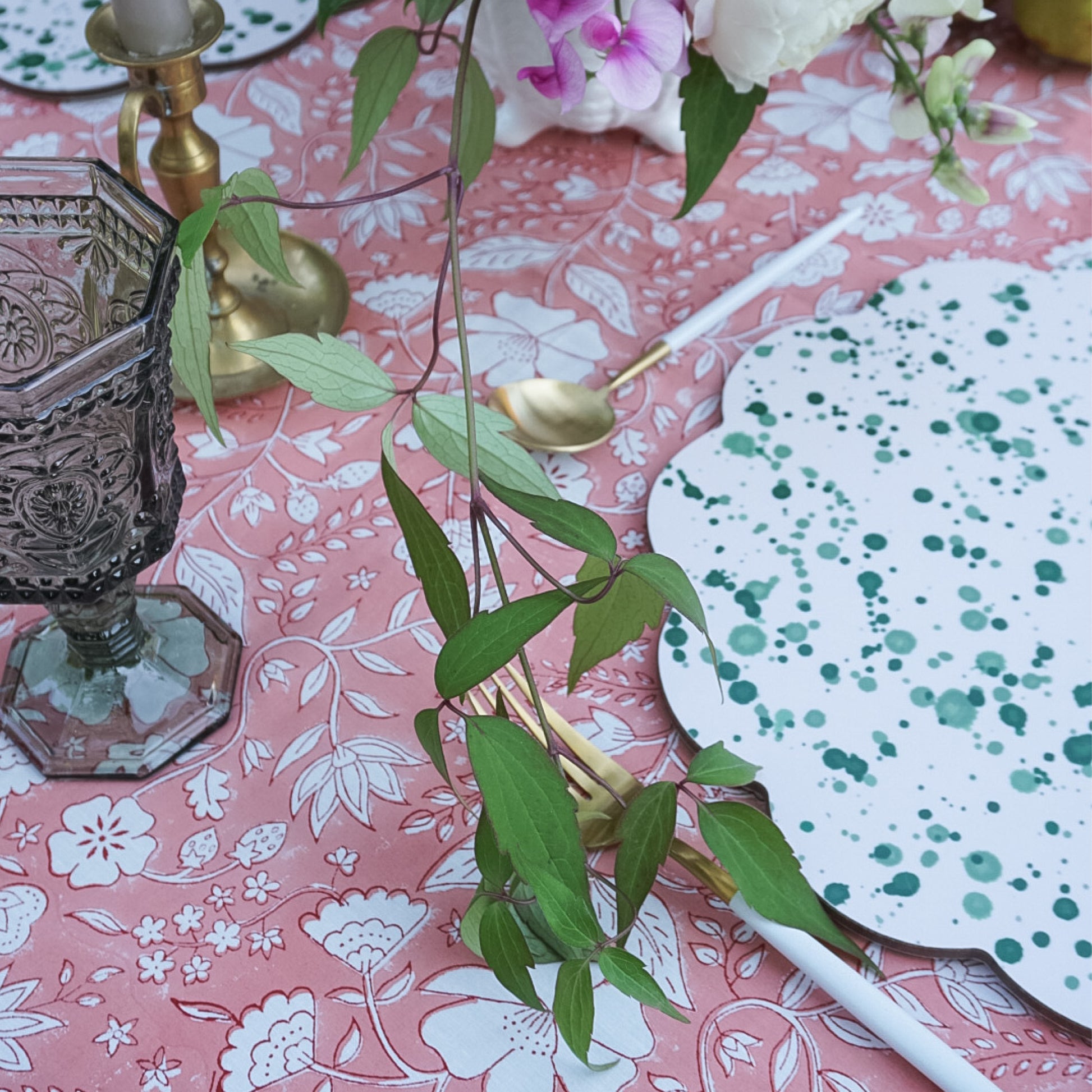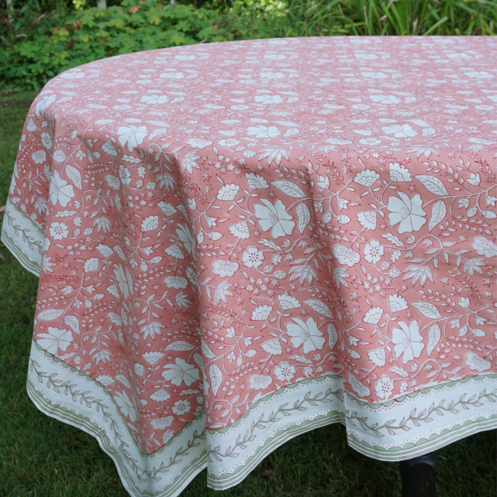 Each tablecloth begins as a hand-painted design by Jessica , which is then meticulously carved into wooden blocks and hand-printed by skilled artisans in Jaipur.