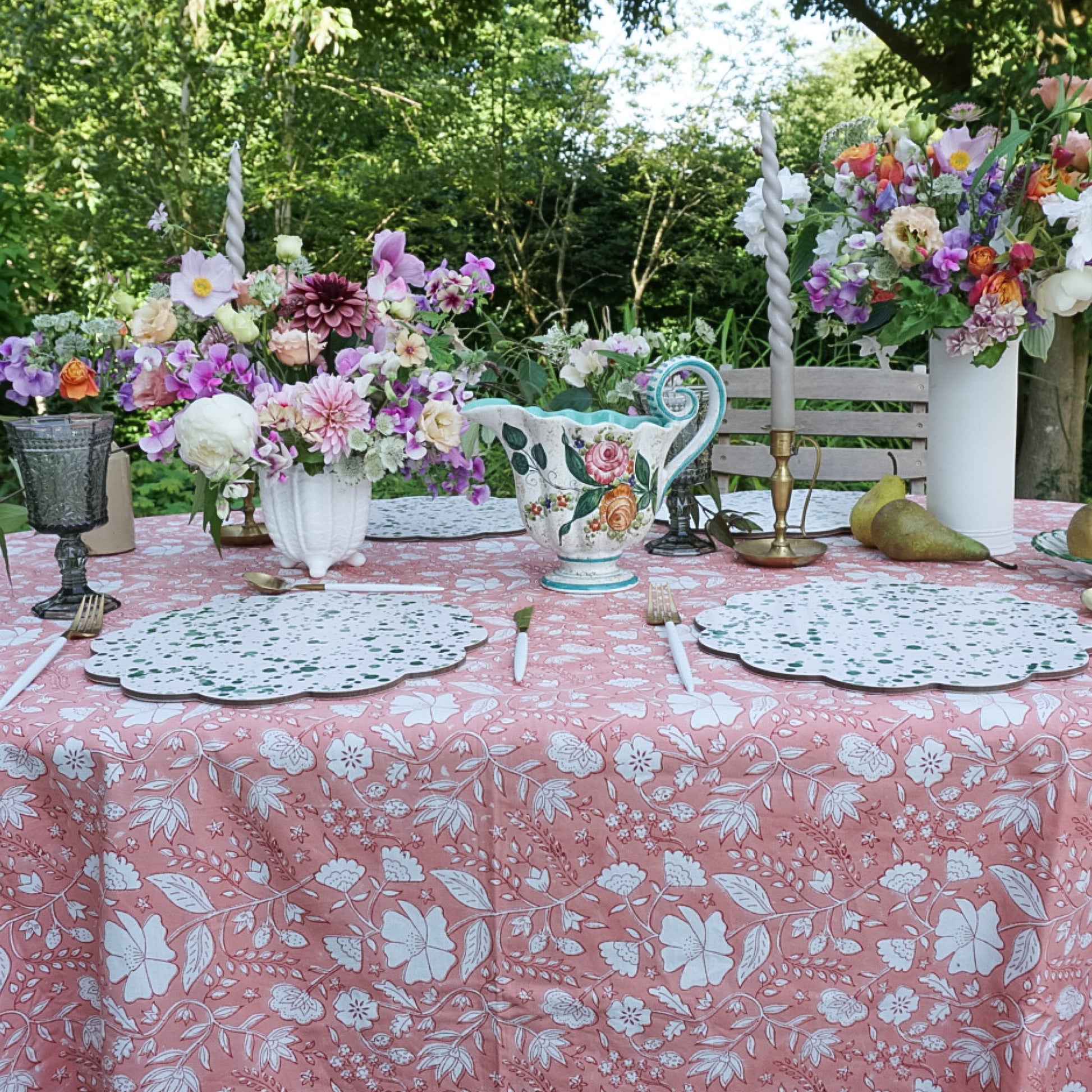 Introducing the Rose Tablecloth in pink, the perfect tablecloth for summer garden parties. The medium and large sizes are finished with a contrast green border whilst the round is finished with a whimsical frill.