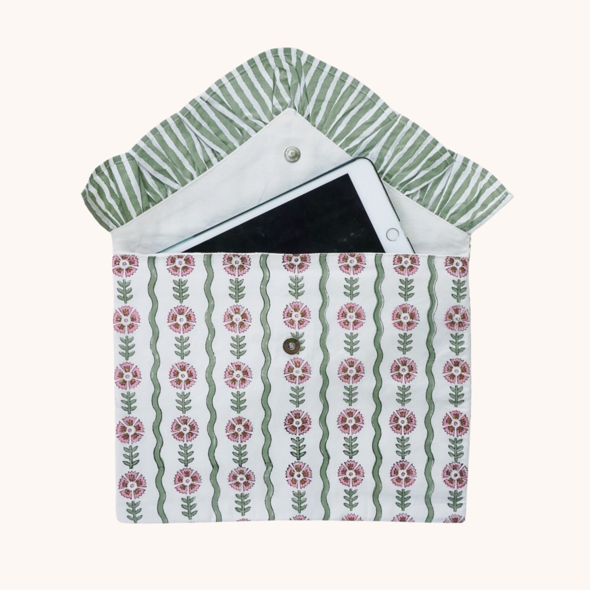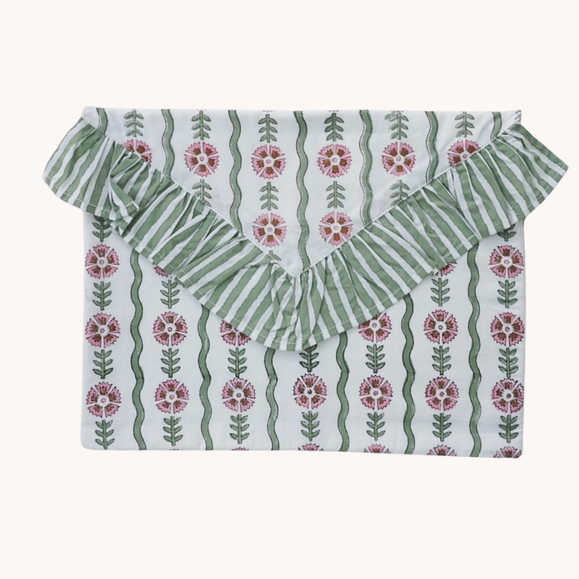 Each clutch is hand block-printed by skilled artisans using our hand-drawn patterns, so every piece is slightly unique. Crafted from natural cotton and fully lined with three separate compartments, it keeps your essentials organised while looking effortlessly chic.