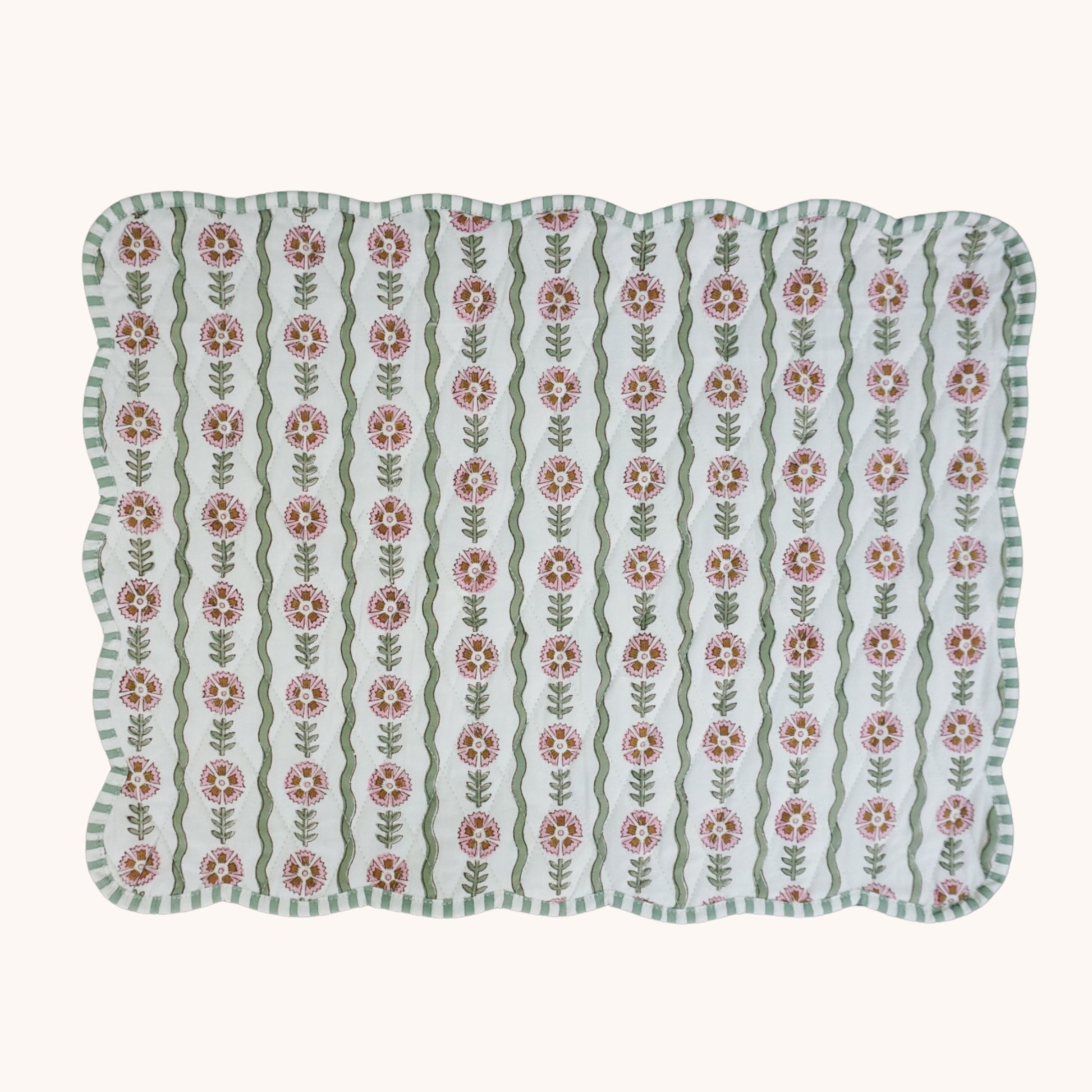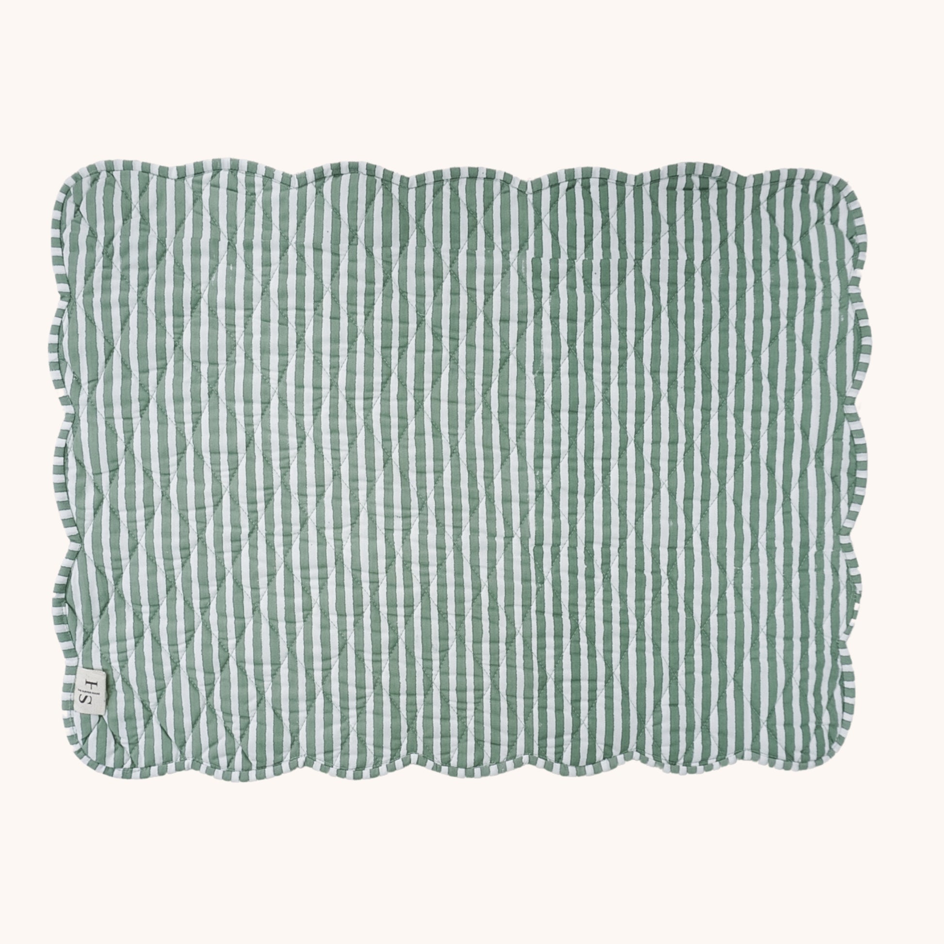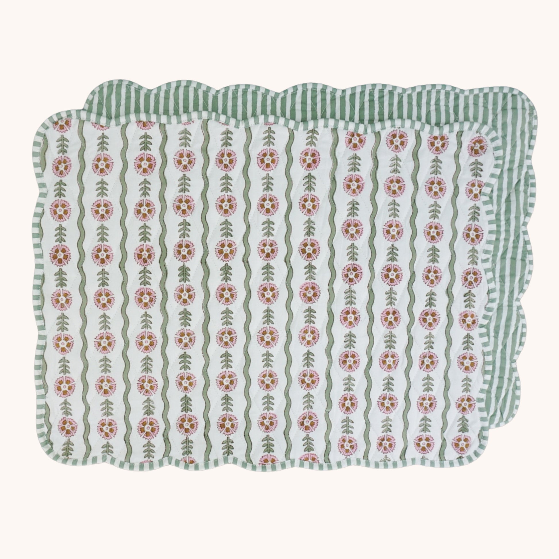 Our beloved Thea design has been reimagined into quilted placemats. Designed to be reversible with stripes on the other side. The mats are quilted and finished with a scalloped edge.