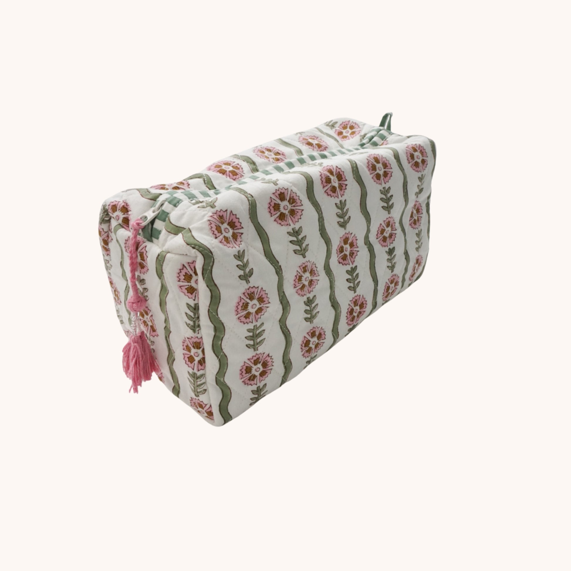 Each wash bag is hand block-printed by skilled artisans using our hand-drawn patterns, so every piece is slightly unique. Crafted from natural cotton and fully lined with four internal pockets, it keeps your essentials organised while looking effortlessly chic.